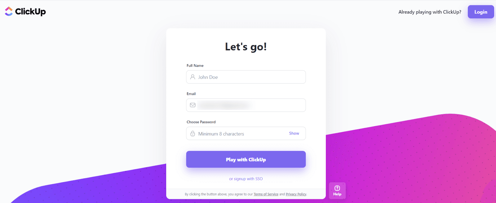 An example of ClickUp's simple sign-up process