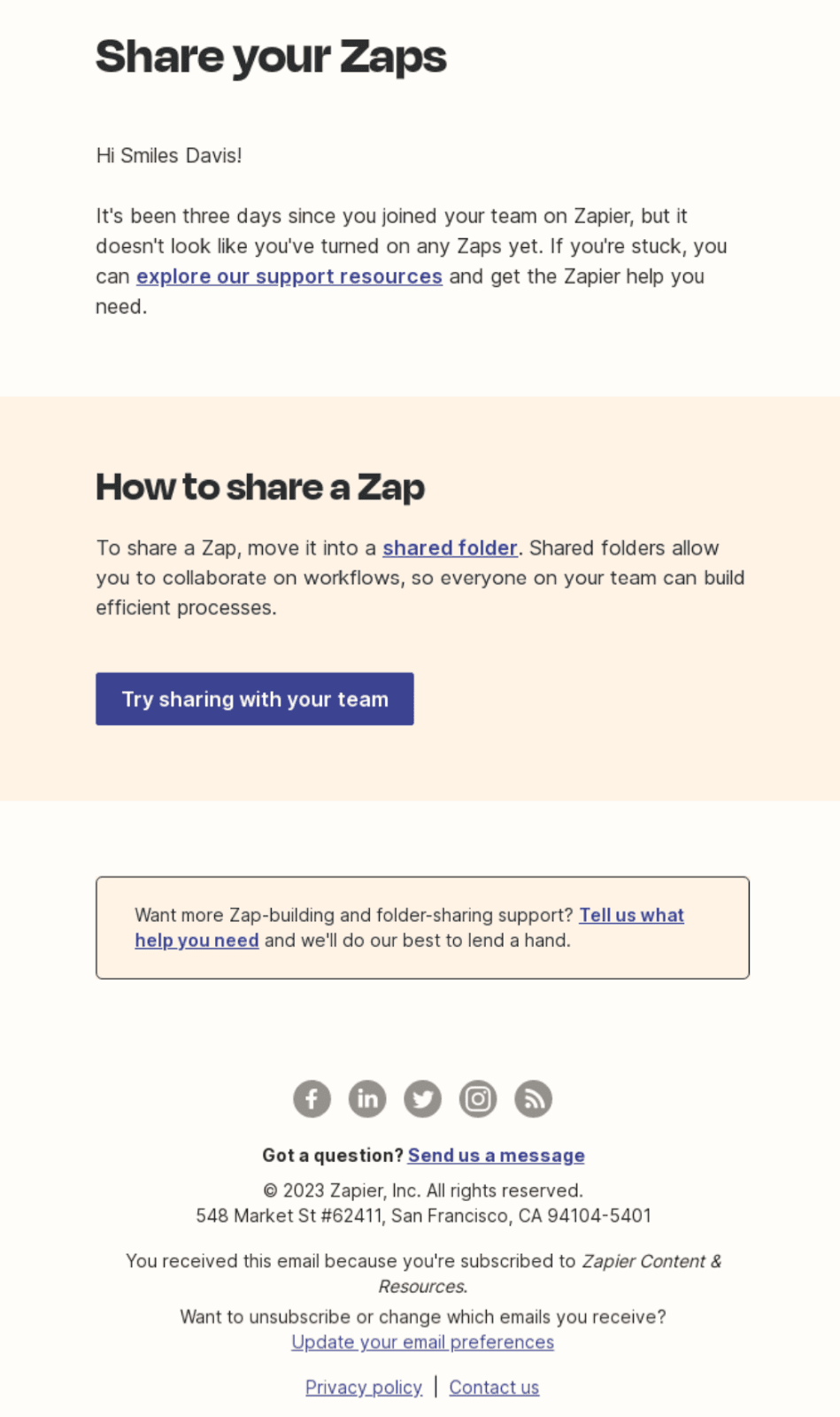 An example of how Zapier sends a check-in email if the user hasn't created a Zap yet