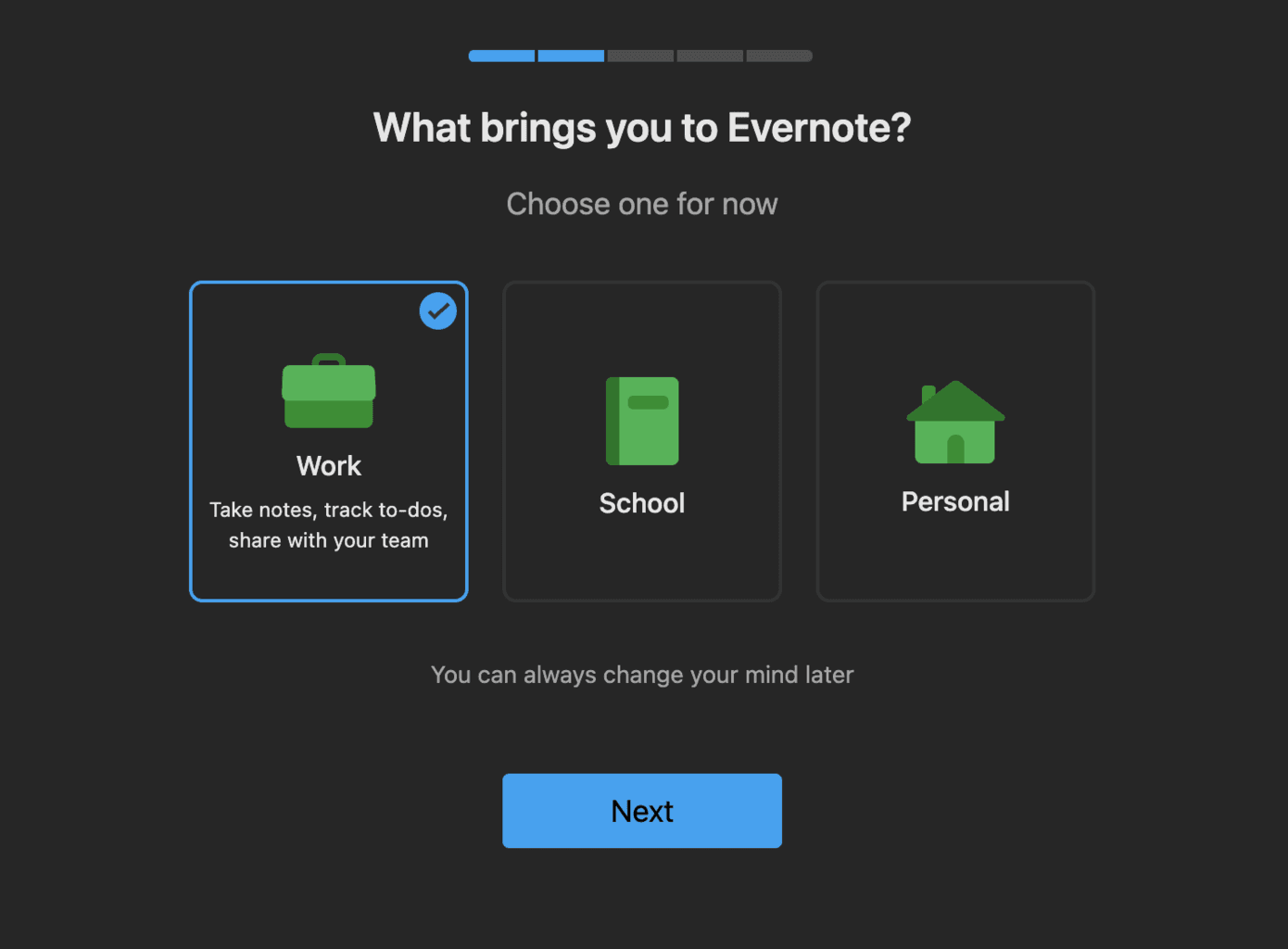 Evernote, a note-taking software, offers a straightforward onboarding experience where you can choose your preferred usage type. Based on that, it'll take you to the dedicated sequence, allowing you to try a more focused sequence.