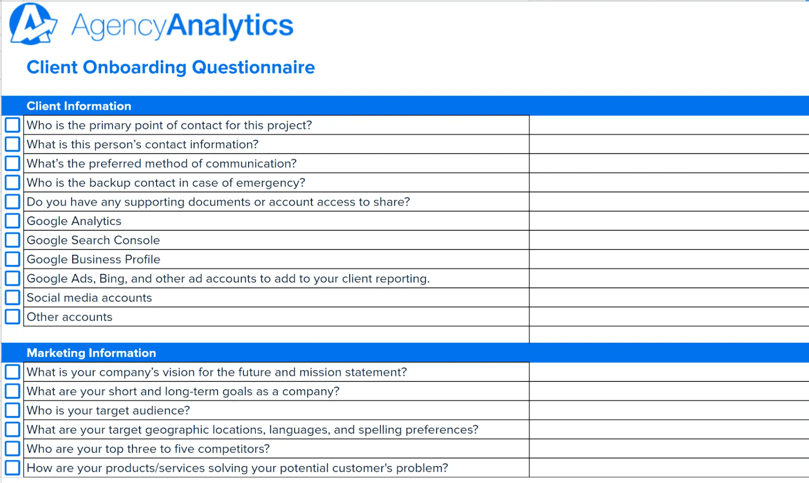 If you have a service-based business, this client onboarding questionnaire aligns more with what you need to do. Agency Analytics offers an in-depth questionnaire for agencies that include client information, marketing information, project information, and general data for the engagement.