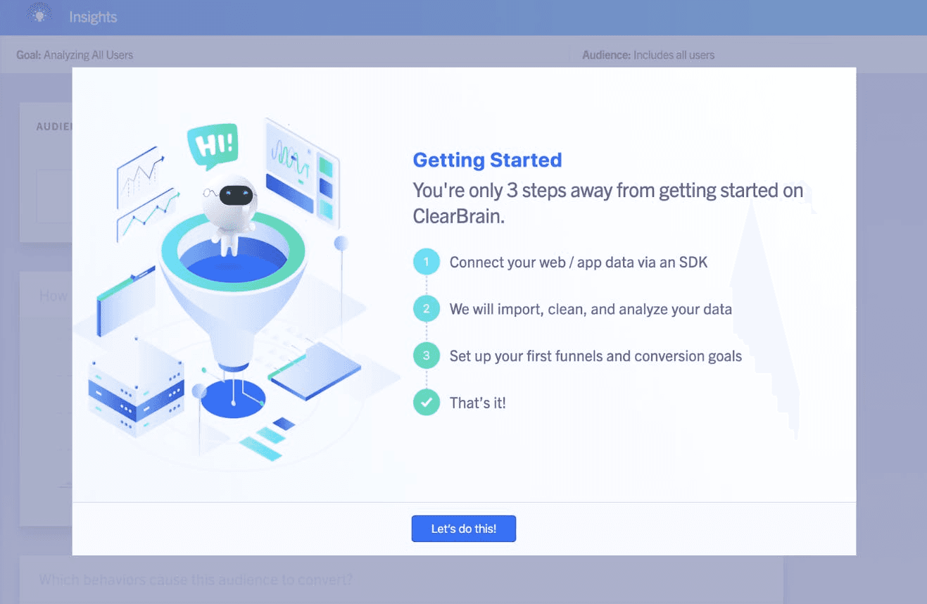Clearbrain, a self-serve predictive analytics software, offers a simple 3-step user onboarding experience that will show you how to easily connect your data, import it, and set up your first funnel. The process is simple—a step-by-step tutorial—leading to a happy customer.