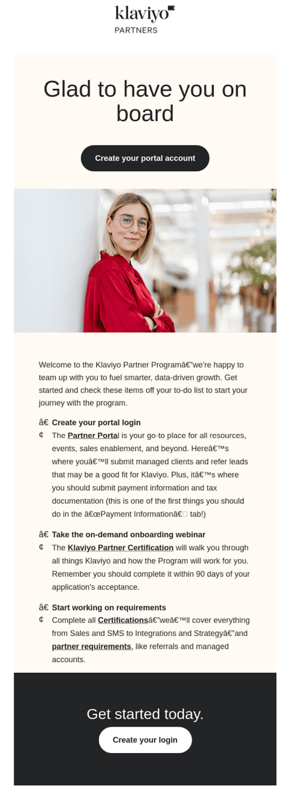 An example of a welcome email from Klaviyo’s Partner Program