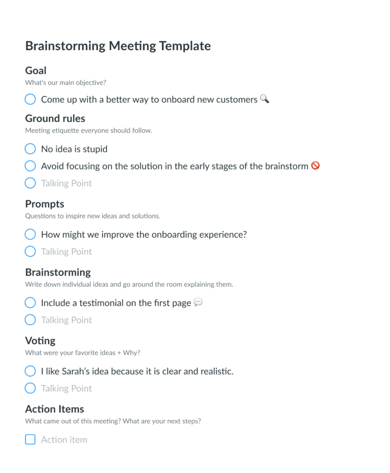 Brainstorming meetings are commonplace in every workplace. Whether you’re coming up with ideas for a new feature or your next marketing campaign, these meetings act as a gateway for creativity for workers. But many teams struggle to conduct these effectively—leading to unproductive and unfocused conversations. To help, in this article, we’ll review the basics of a brainstorming meeting, how to structure it, tips for running it successfully, and tools to ensure brainstorming isn’t a bust.