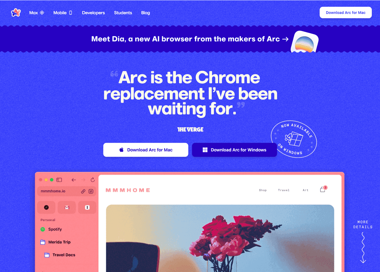 Arc Browser (+ Dia) | Space and tab organization, creative flow | Knowledge workers and creatives who live in their browser |