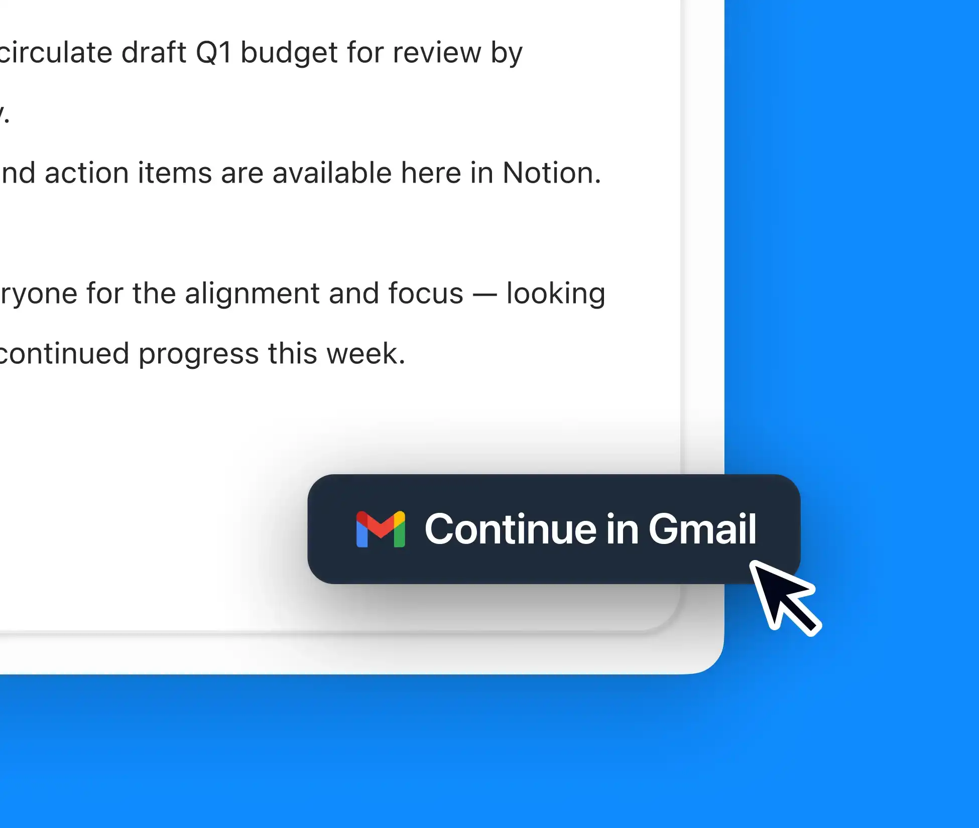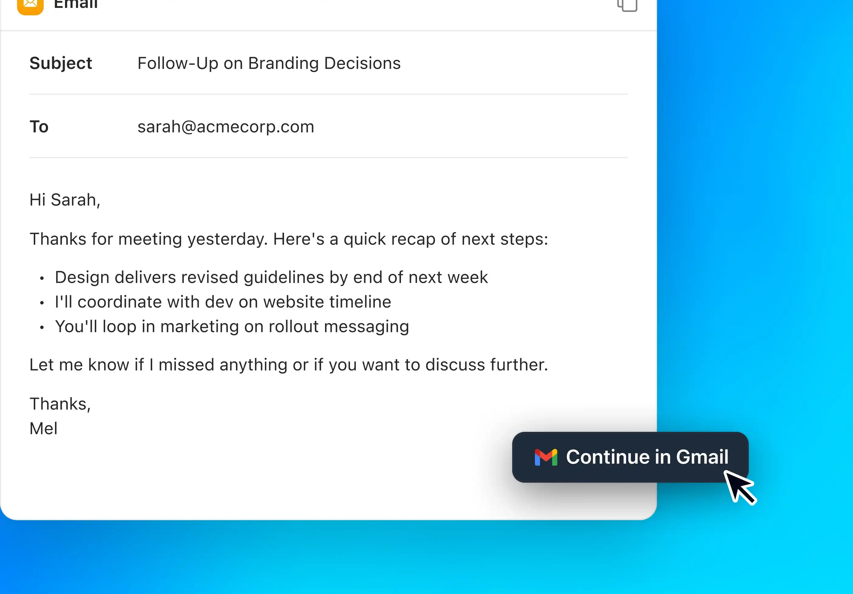 Meeting discussions become drafted emails. Review, personalize, and send directly from Gmail.