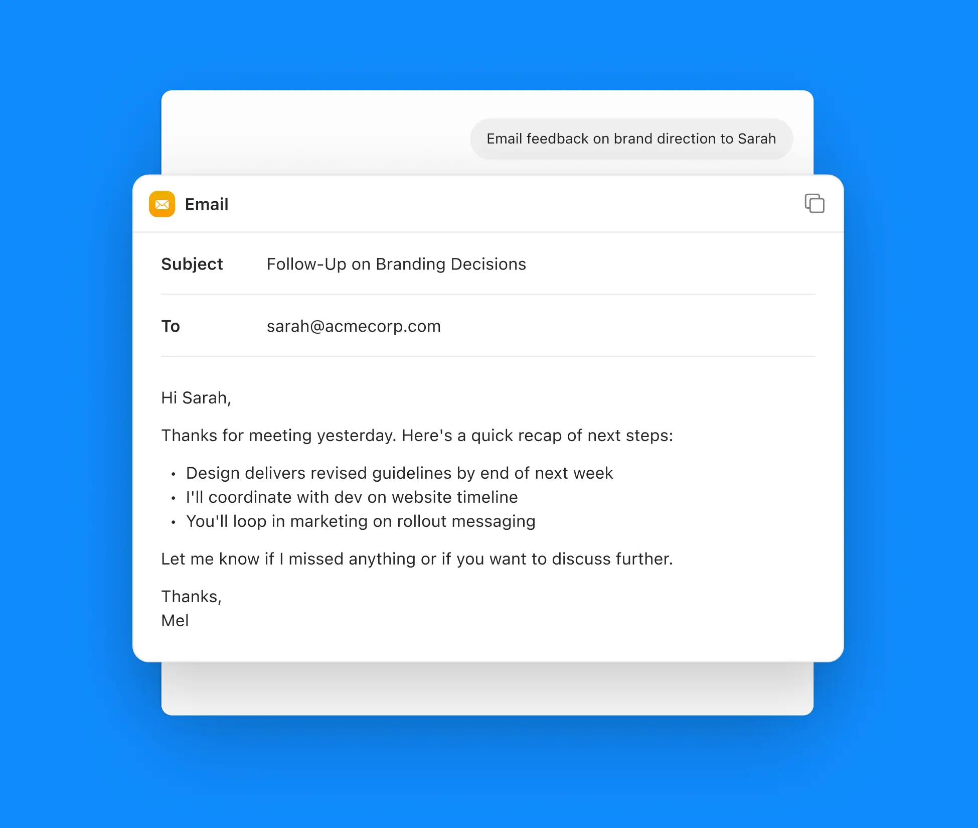 Get contextual email suggestions after each conversation based on what was discussed and what needs to happen next.