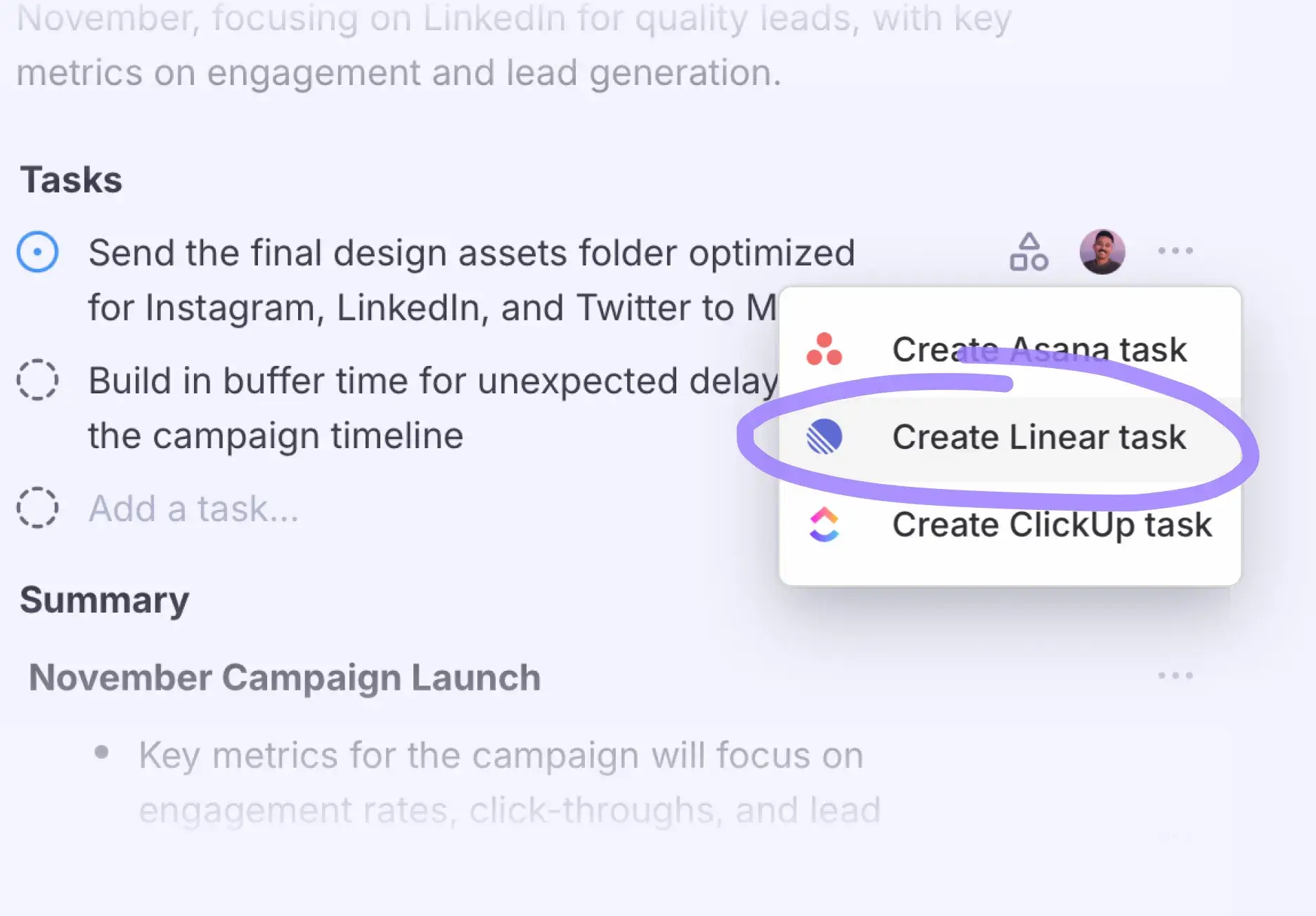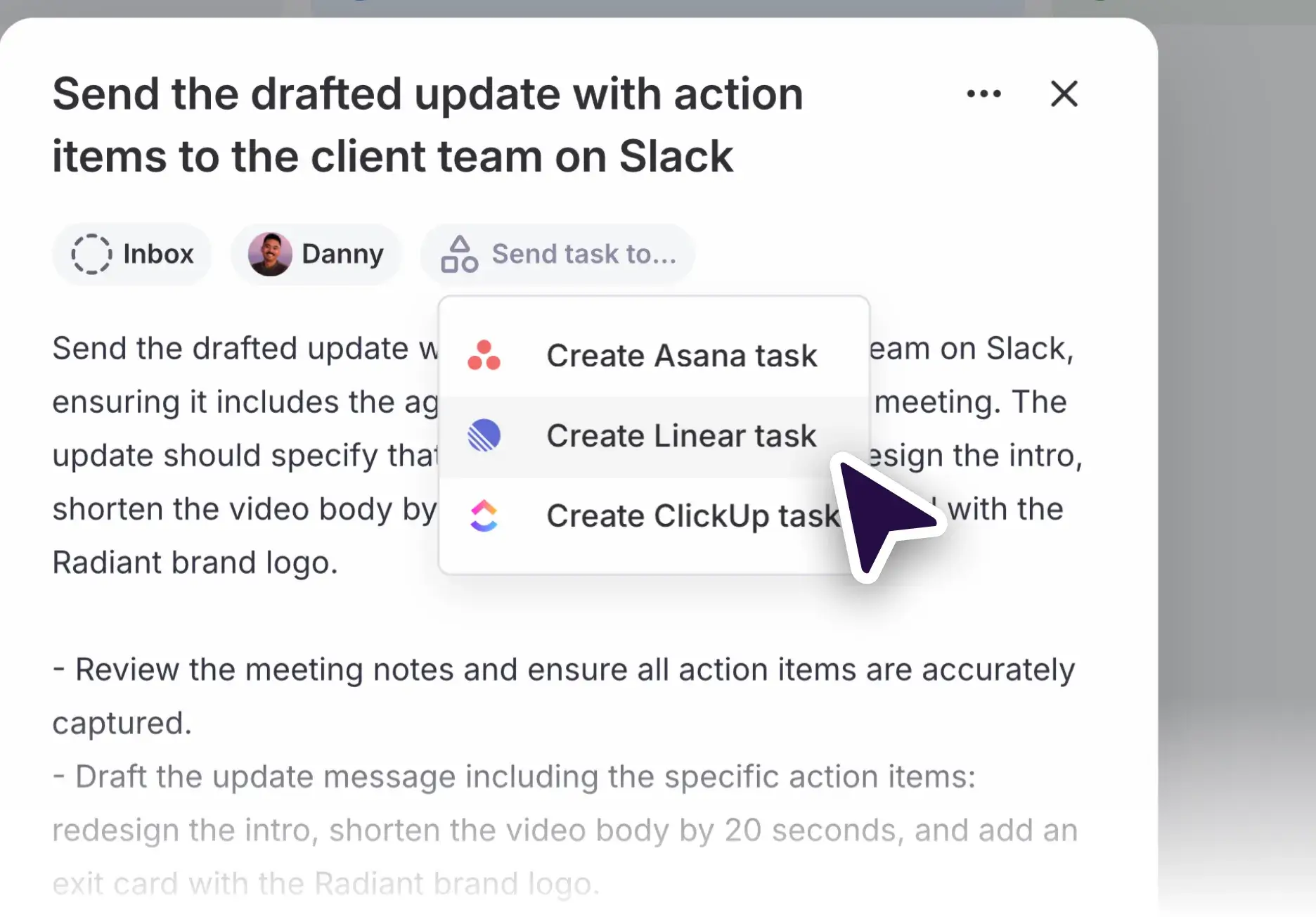When creating a Linear task, select the right assignee and team directly from Supernormal.