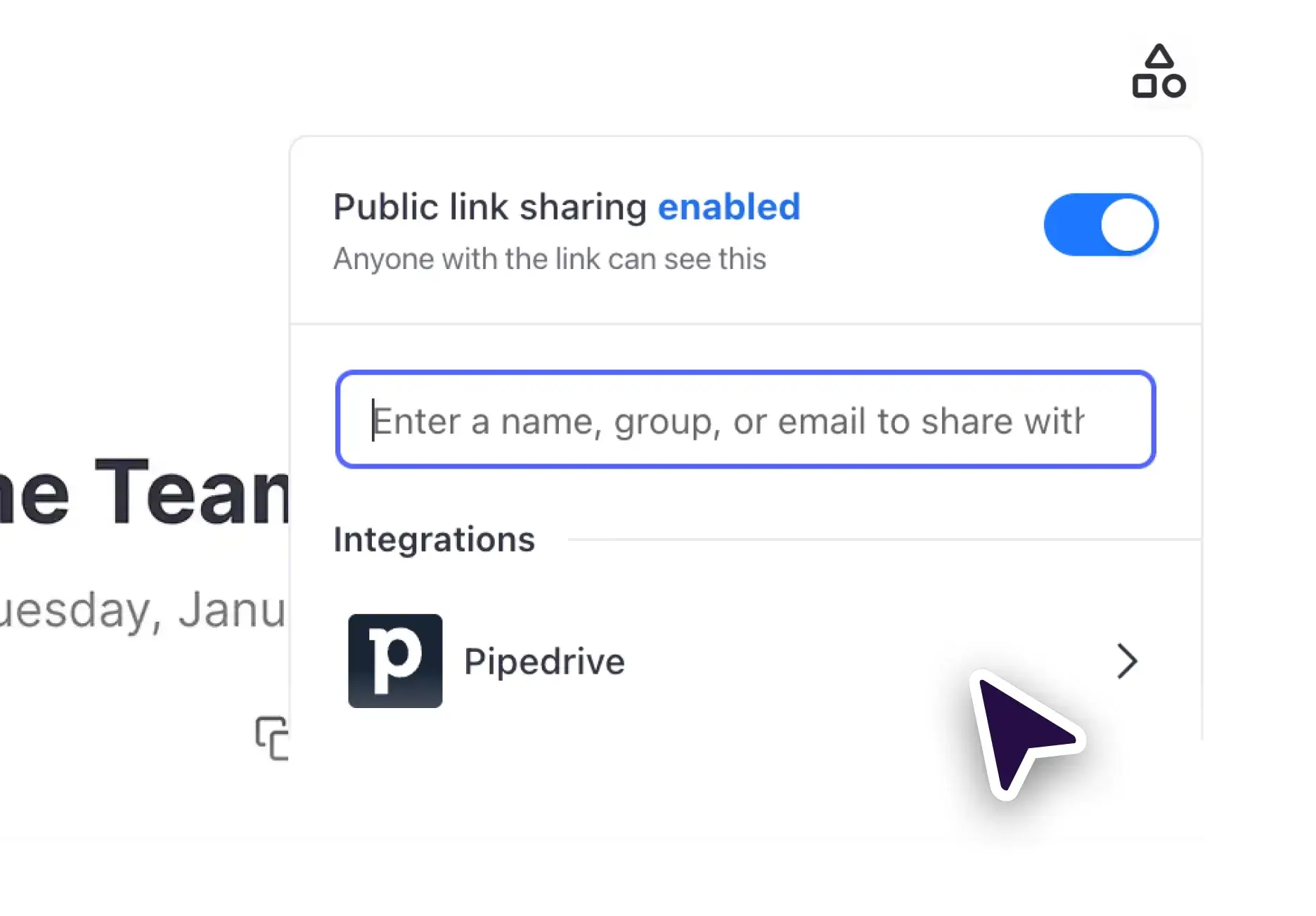 From any meeting, use the Pipedrive integration in your share menu to send recordings and highlights instantly.