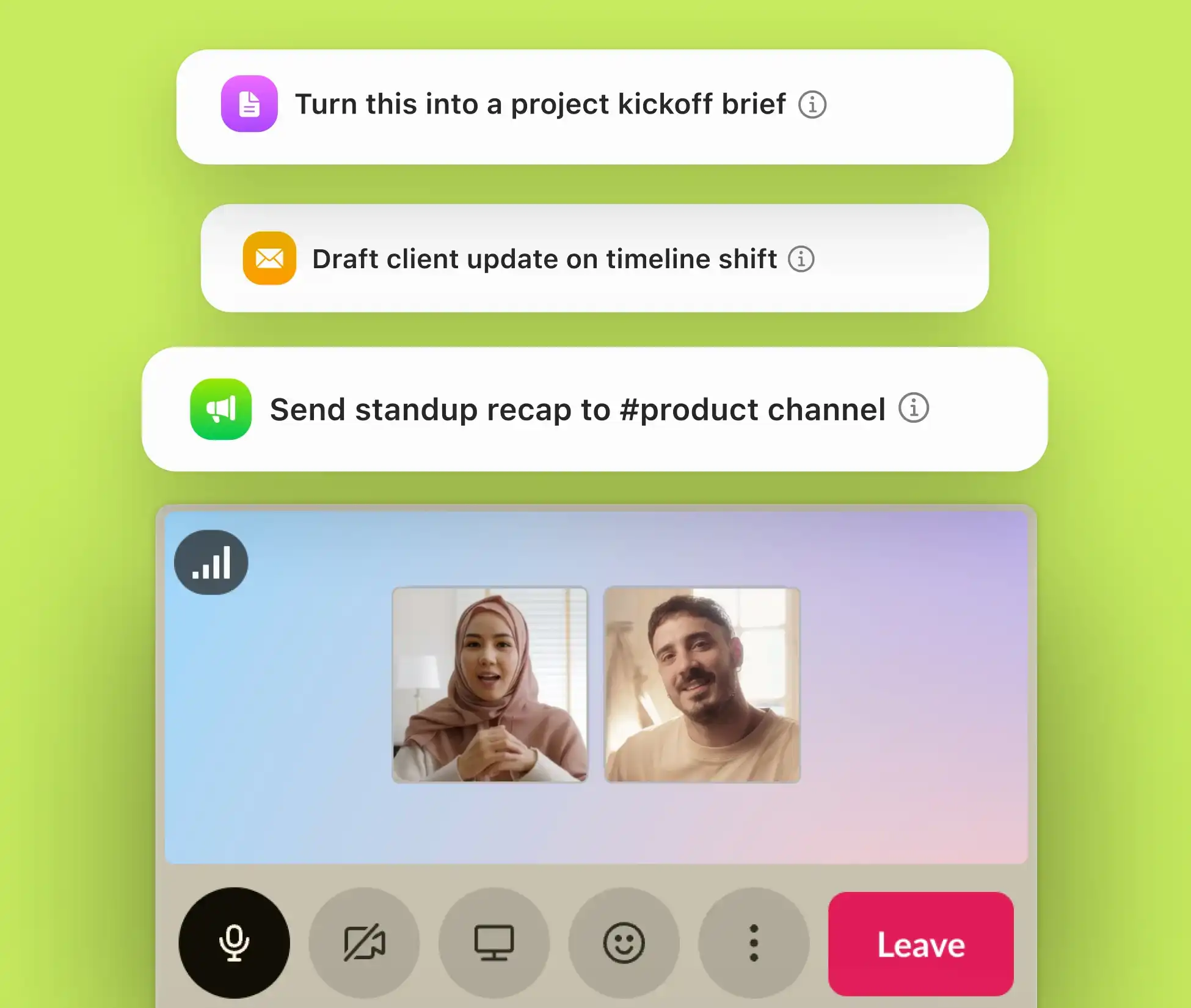 Draft summaries of Slack Huddle discussions. Share notes, decisions, and action items with teammates who couldn't join.