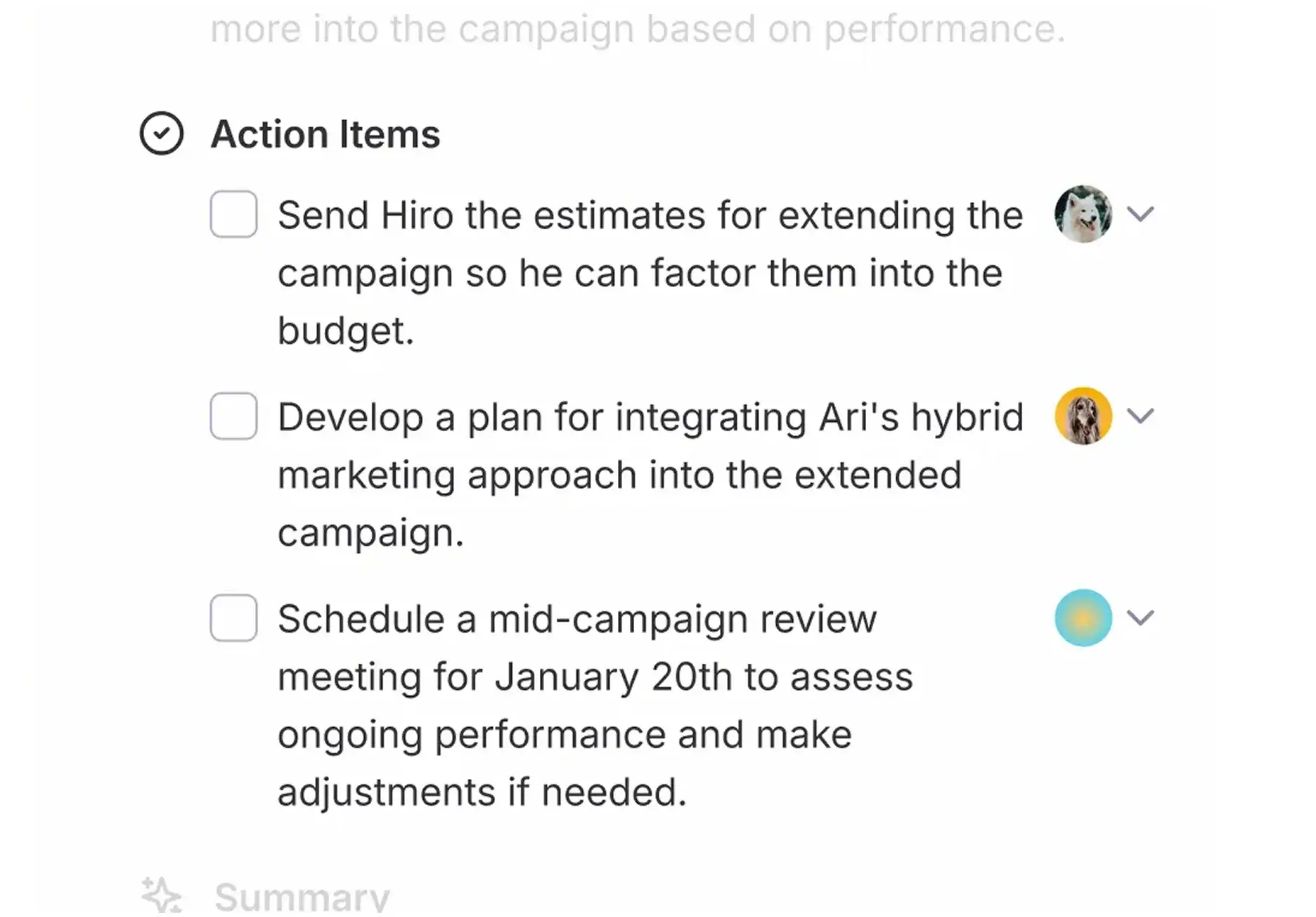 Follow-ups and next steps are automatically identified and grouped under clear action items.