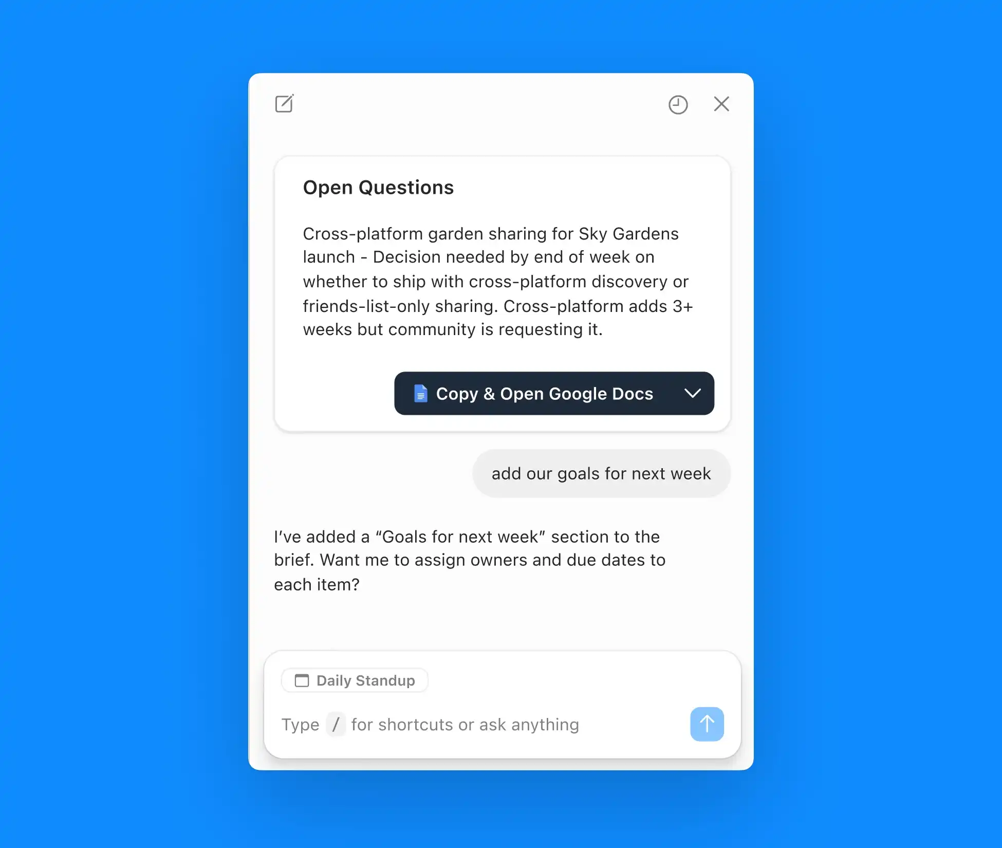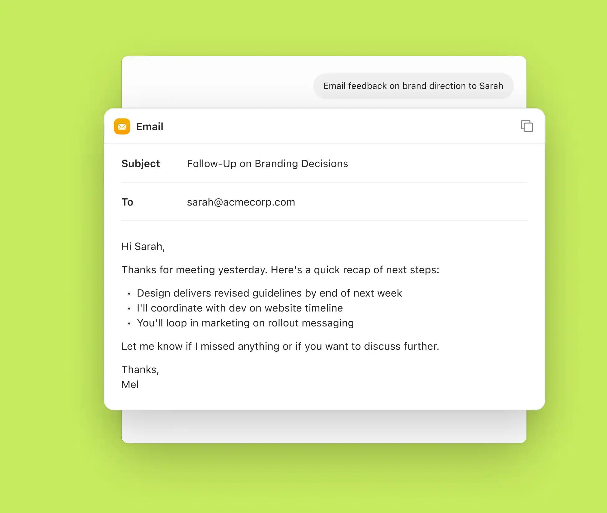 Chat with Supernormal to adjust drafts before sending or syncing. Add details, change tone, or refine content.