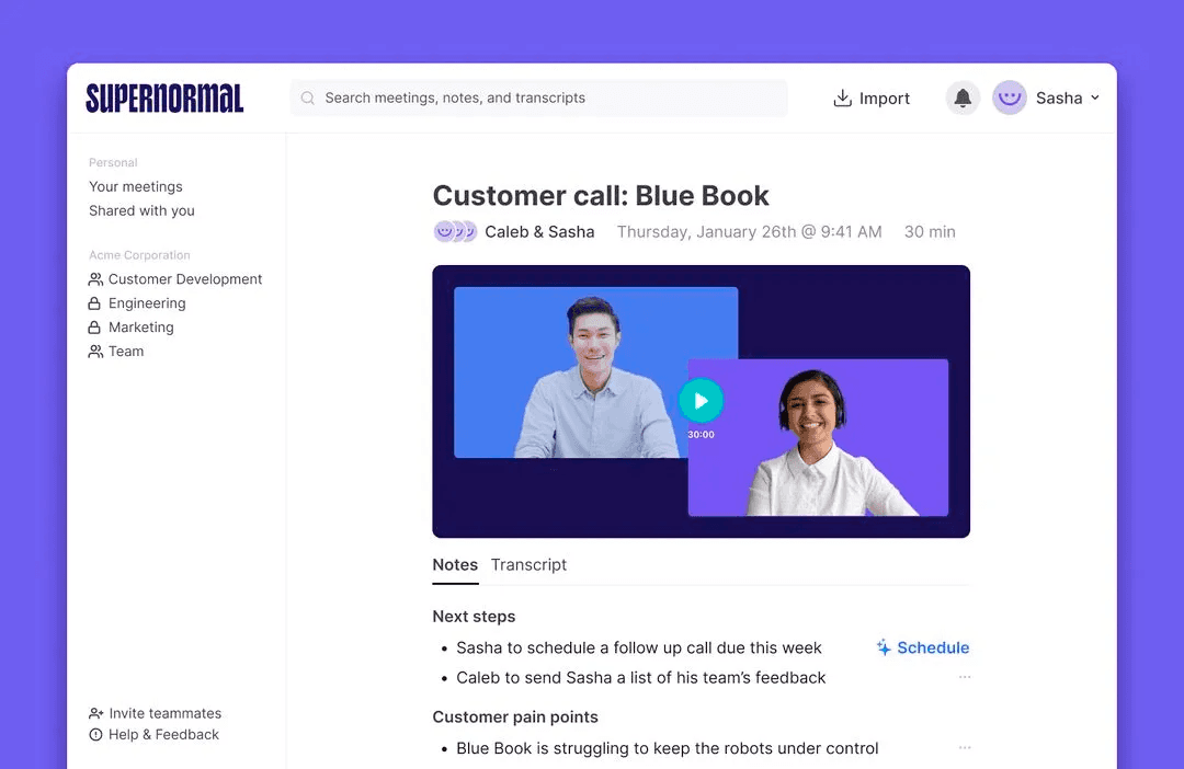 É aí que entra o Supernormal. O sistema de tomada de notas automático do Supernormal usa processamento de linguagem natural para fazer anotações em tempo real. Ele pode transcrever a conversa, destacar os principais pontos de destaque e criar atas de reunião para que você possa facilmente se concentrar e lembrar o que foi discutido.