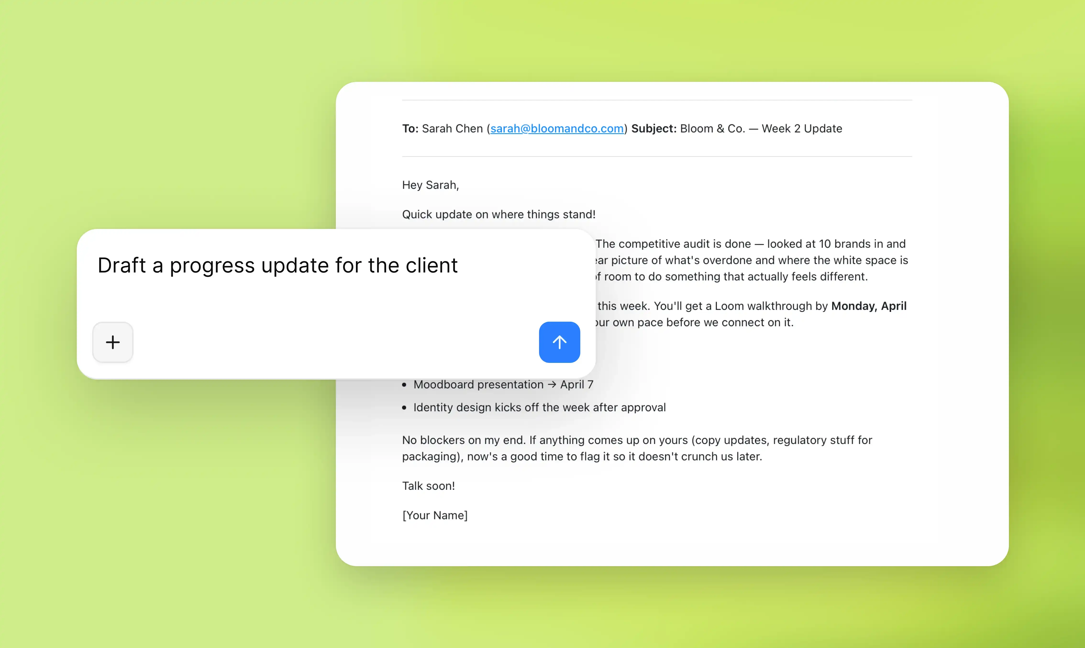 Proposals, contracts, and communications completed in moments, based on your unique client context. You just review and send.