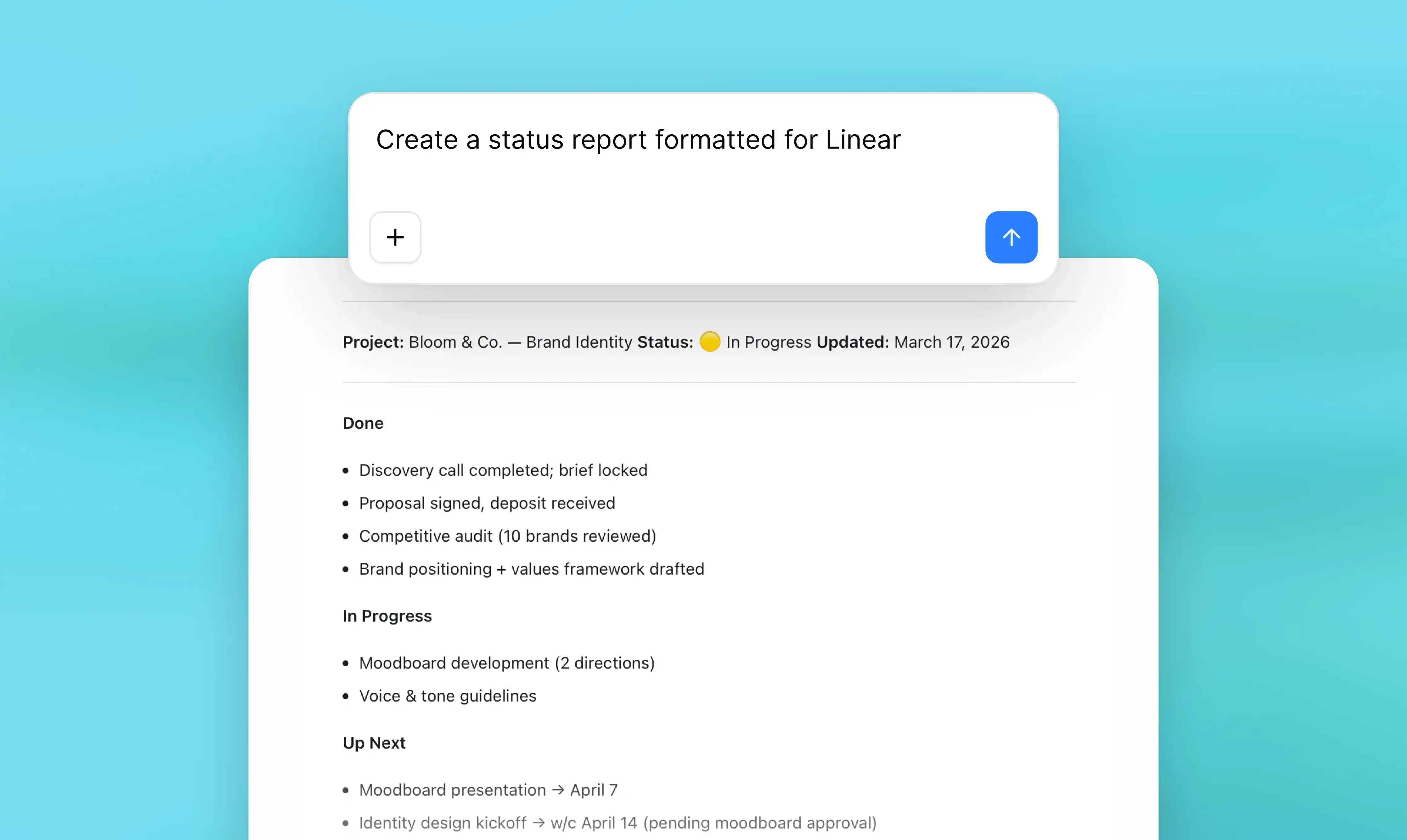 Progress updates, milestone summaries, and reports ready to share. Keep people in the loop without writing anything manually.