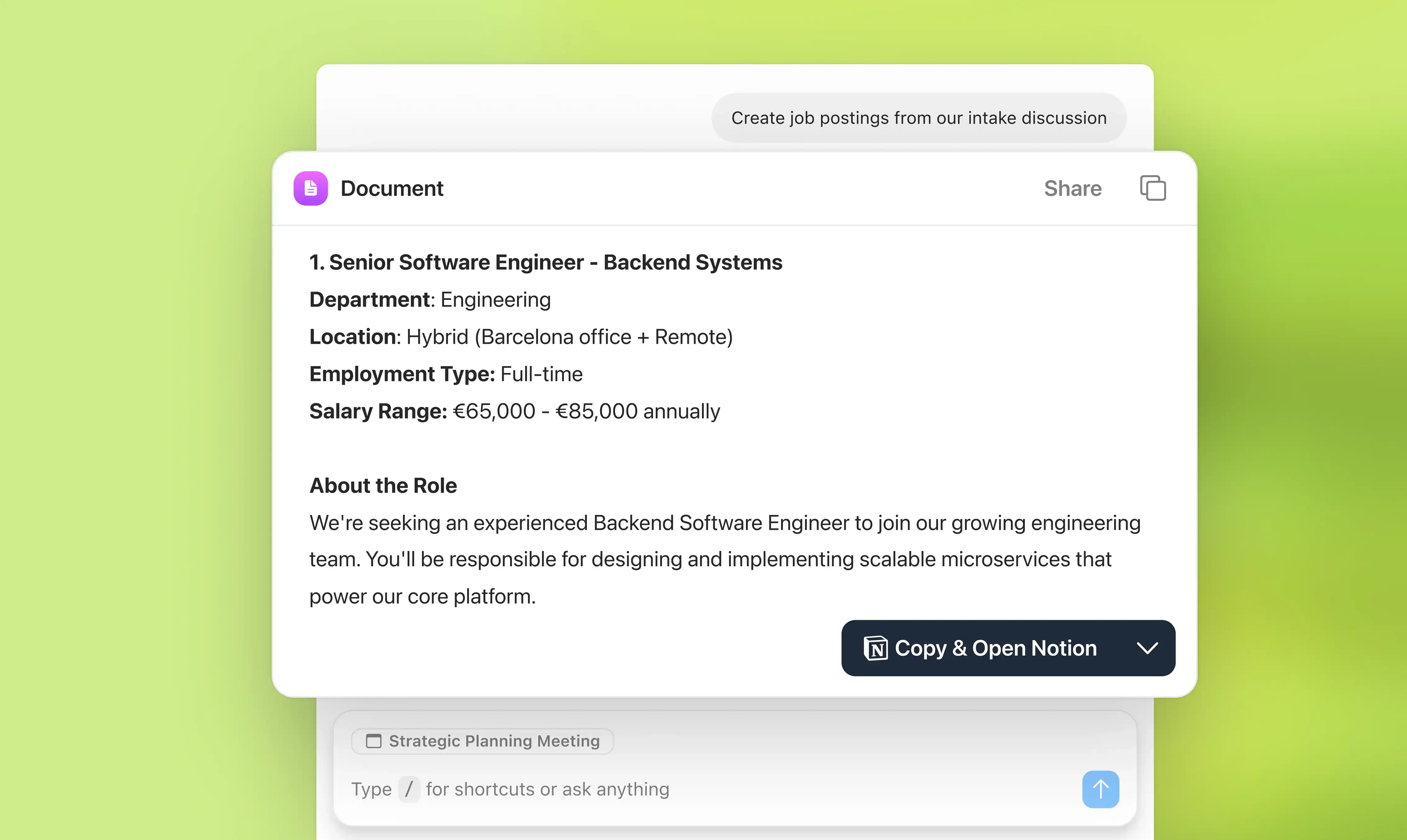 Interview write-ups, job postings, offer emails, and candidate slide decks done for you. Just review and send.