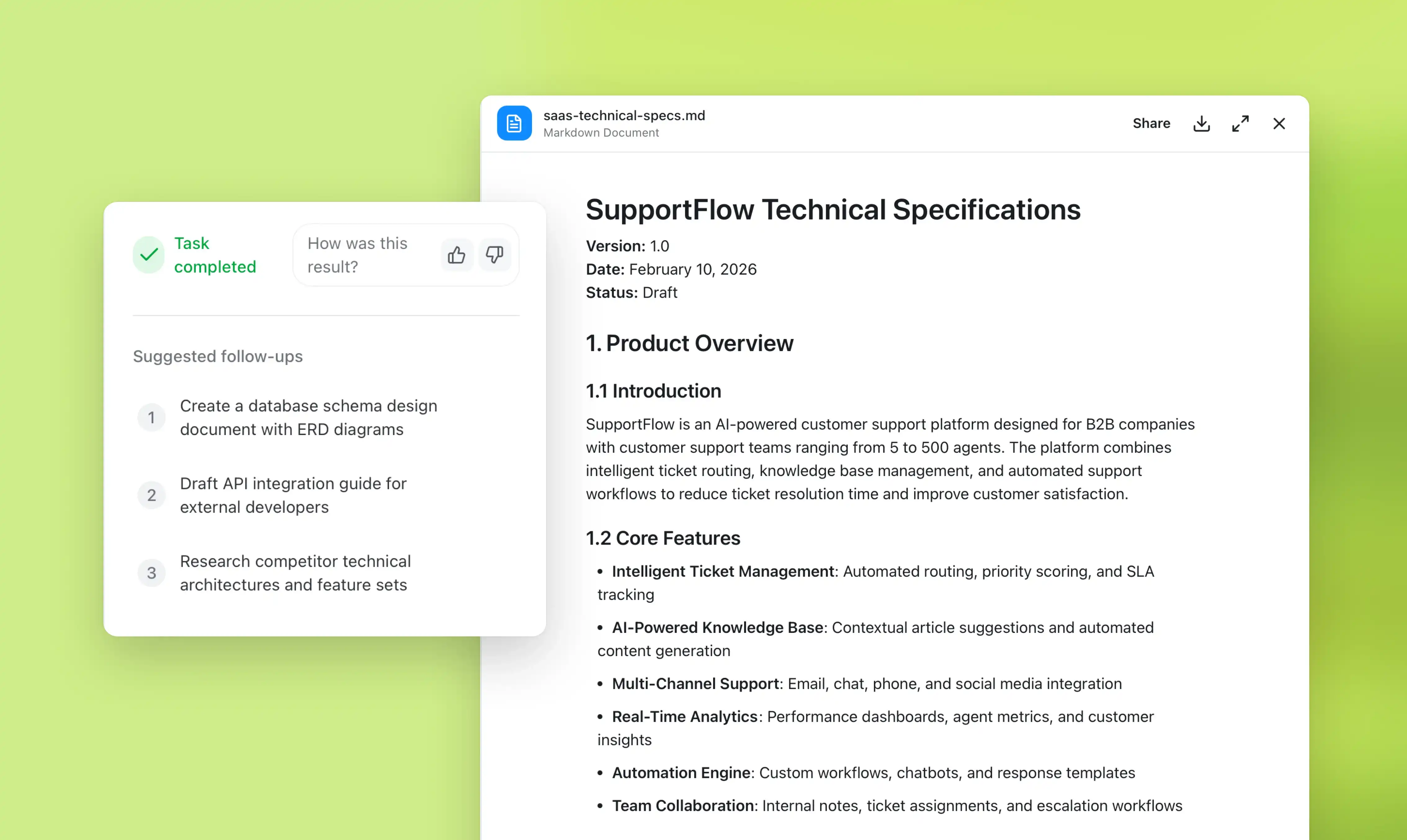 Product requirements, technical specs, and feature documentation created by pre-built agents that connect to your meetings, email, docs, and cal. Move from discovery to development faster.