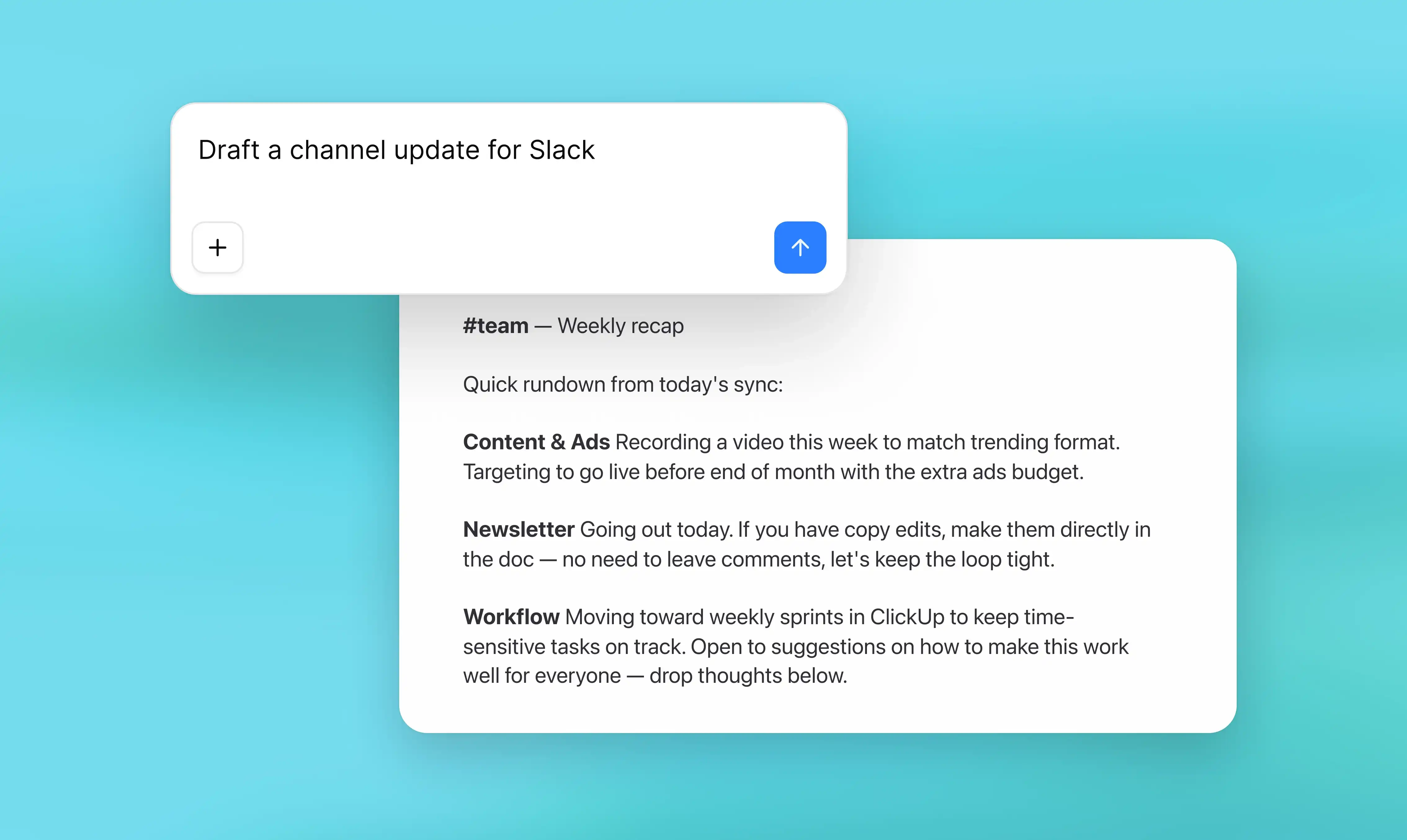 Slack channel posts and thread replies ready to share. Your team stays in the loop without you writing anything from scratch.