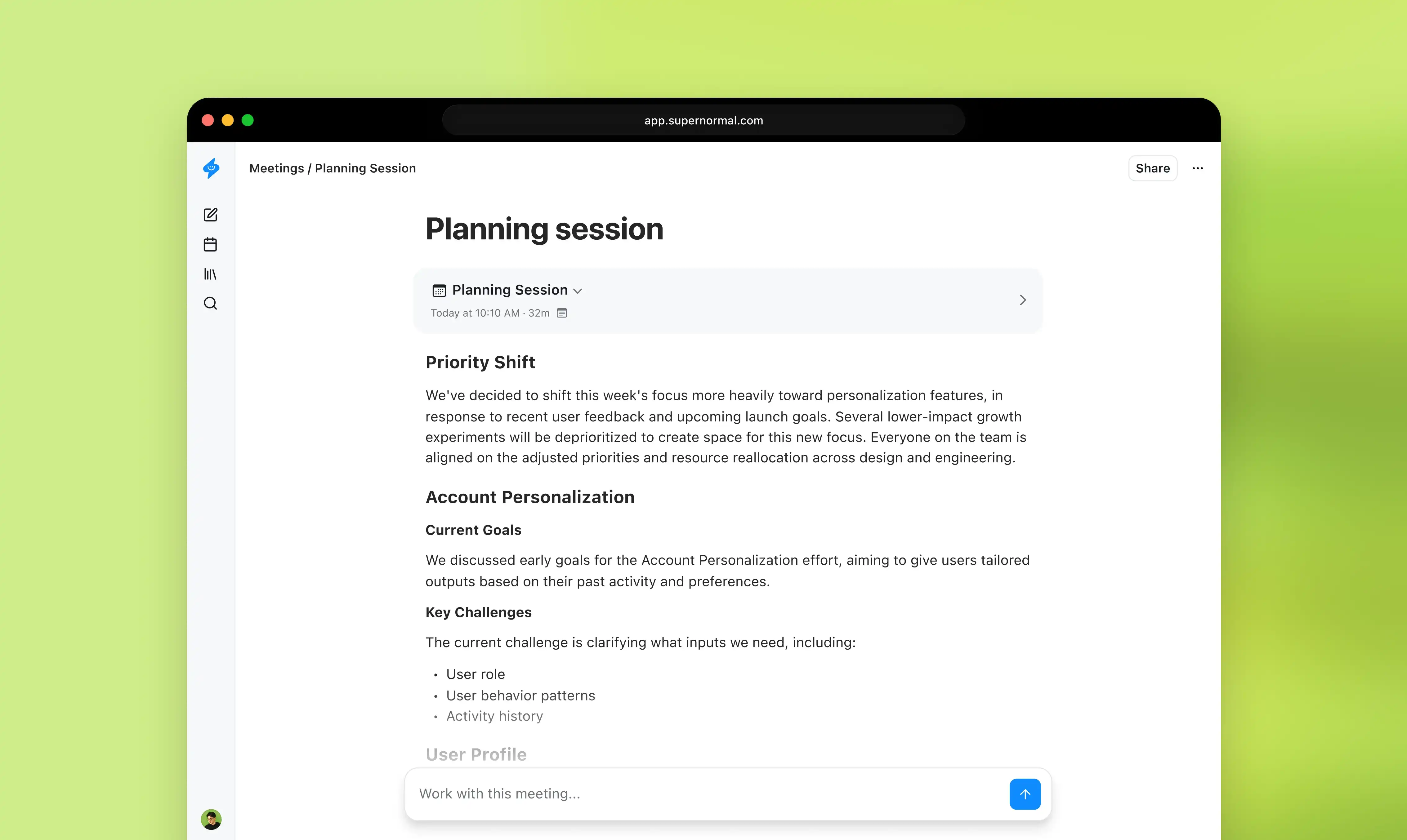 Supernormal captures what happens in meetings, connects to your emails and documents, and gives you the AI agents you need to complete your task list in a flash.